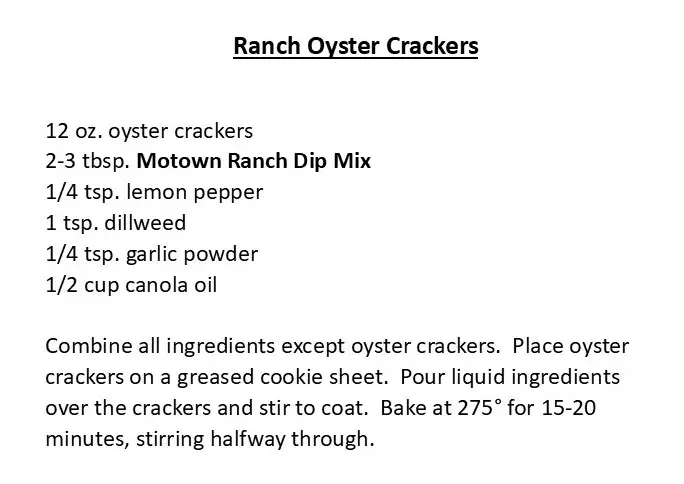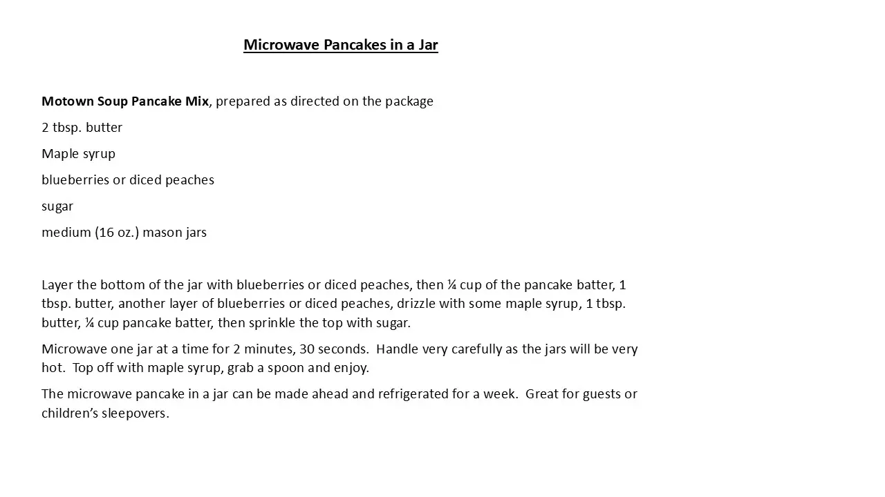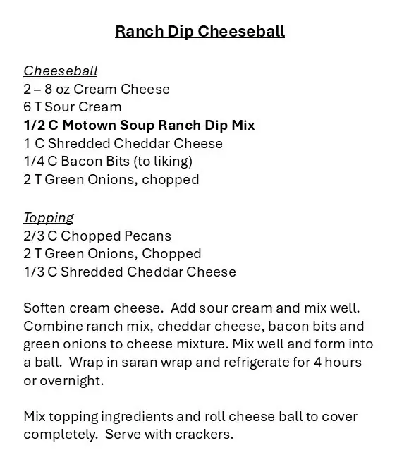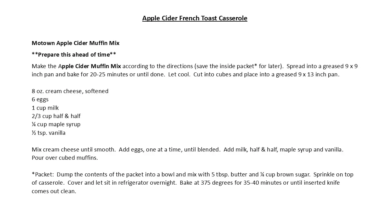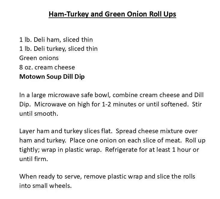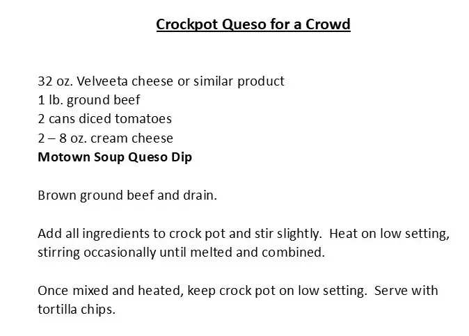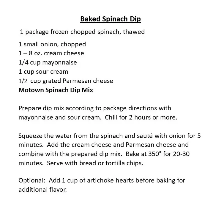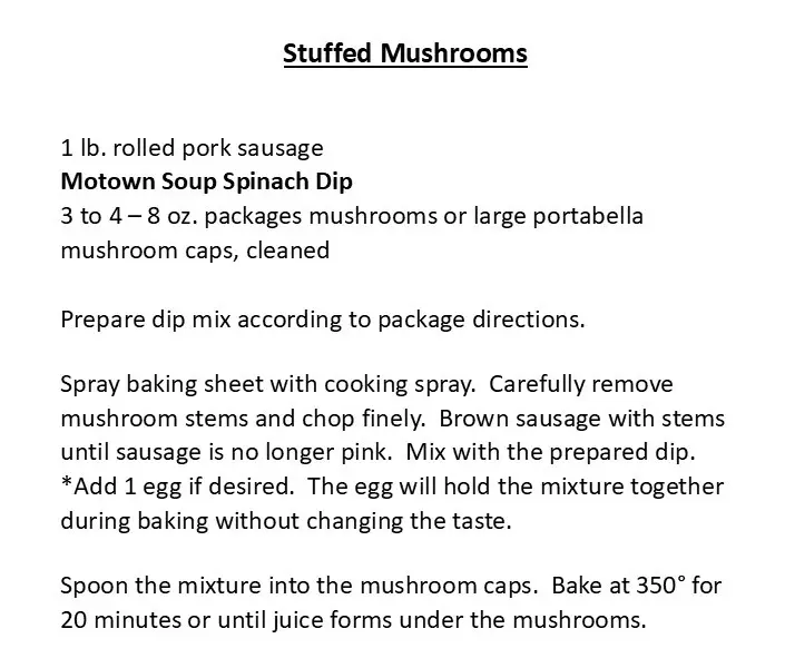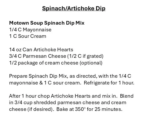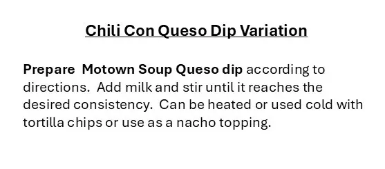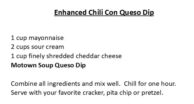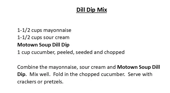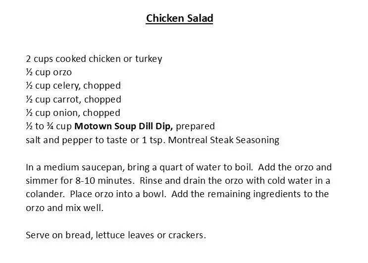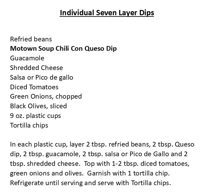 RECIPES *Note: Recipes are categorized by the Motown Soup product in the recipe. SOUPS Minestrone Casserole Broccoli Rice Chicken Casserole Cheeseburger Macaroni and Cheese Chicken Pot Pie DESSERTS/BAKED GOODS Apple Cider French Toast Casserole Cream Cheese Brownies Microwave Pancakes in a Jar Pancake Mix Egg Casserole Pumpkin Bread Dump Cake Pumpkin Brownie Bites Reese's Brownie Treats DIPS Baked Spinach Dip Chicken Salad Chili Con Queso Dip Variation Crockpot Queso for a Crowd Cucumber Dill Rotisserie Chicken Salad Dill Dip Mix Enhanced Chili Con Queso Dip Glazed Dill Carrots Ham, Turkey & Green Onion Roll Ups Individual Seven Layer Dips Ranch Dip Cheeseball Ranch Oyster Crackers Spinach Artichoke Dip Stuffed Mushrooms Veggie Spinach Pizza MISC